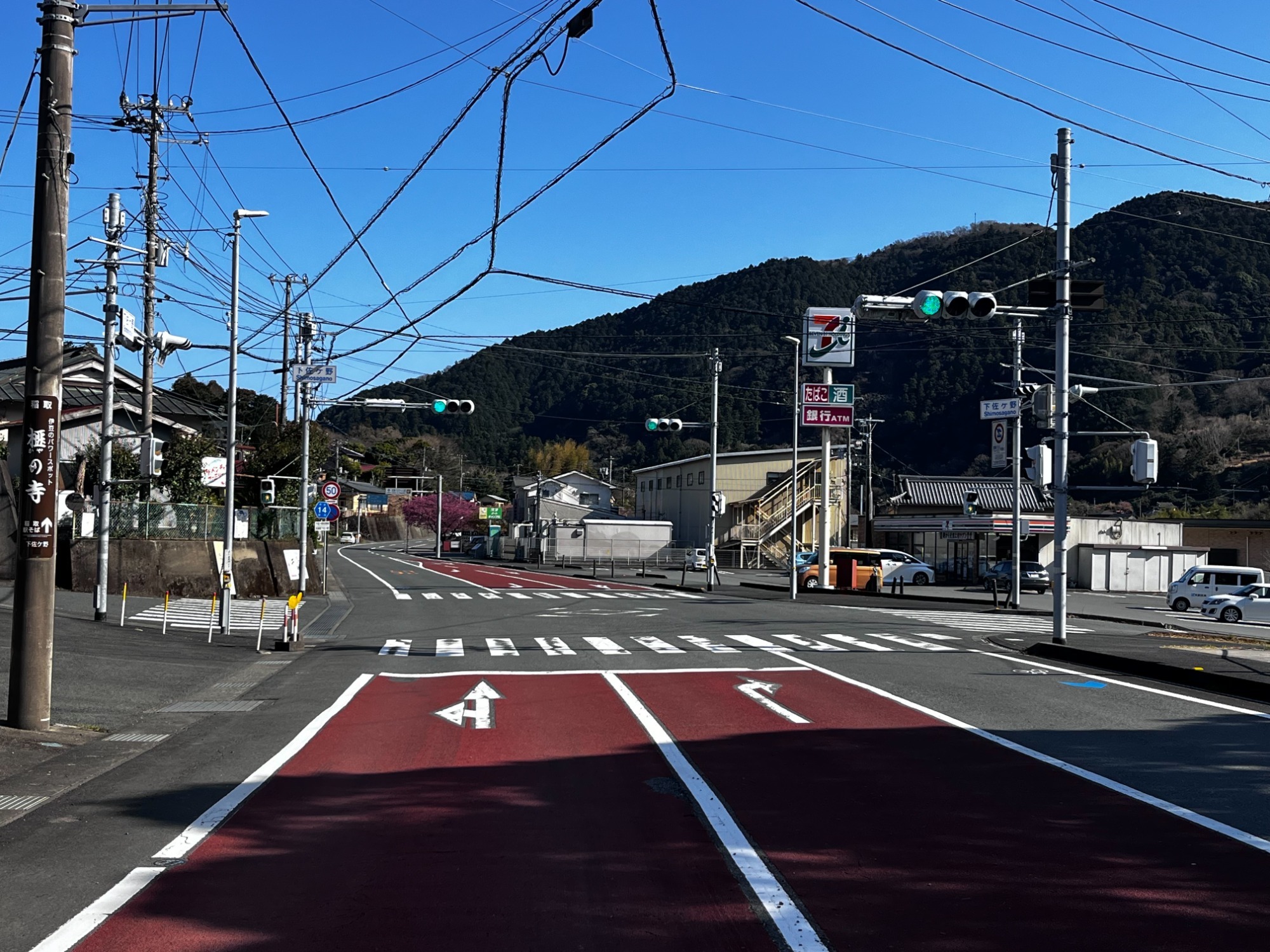 ①沼津方面からお越しの際は、天城峠を越え緩やかな下り坂を進みますと、右手にセブンイレブンが見えてまいります