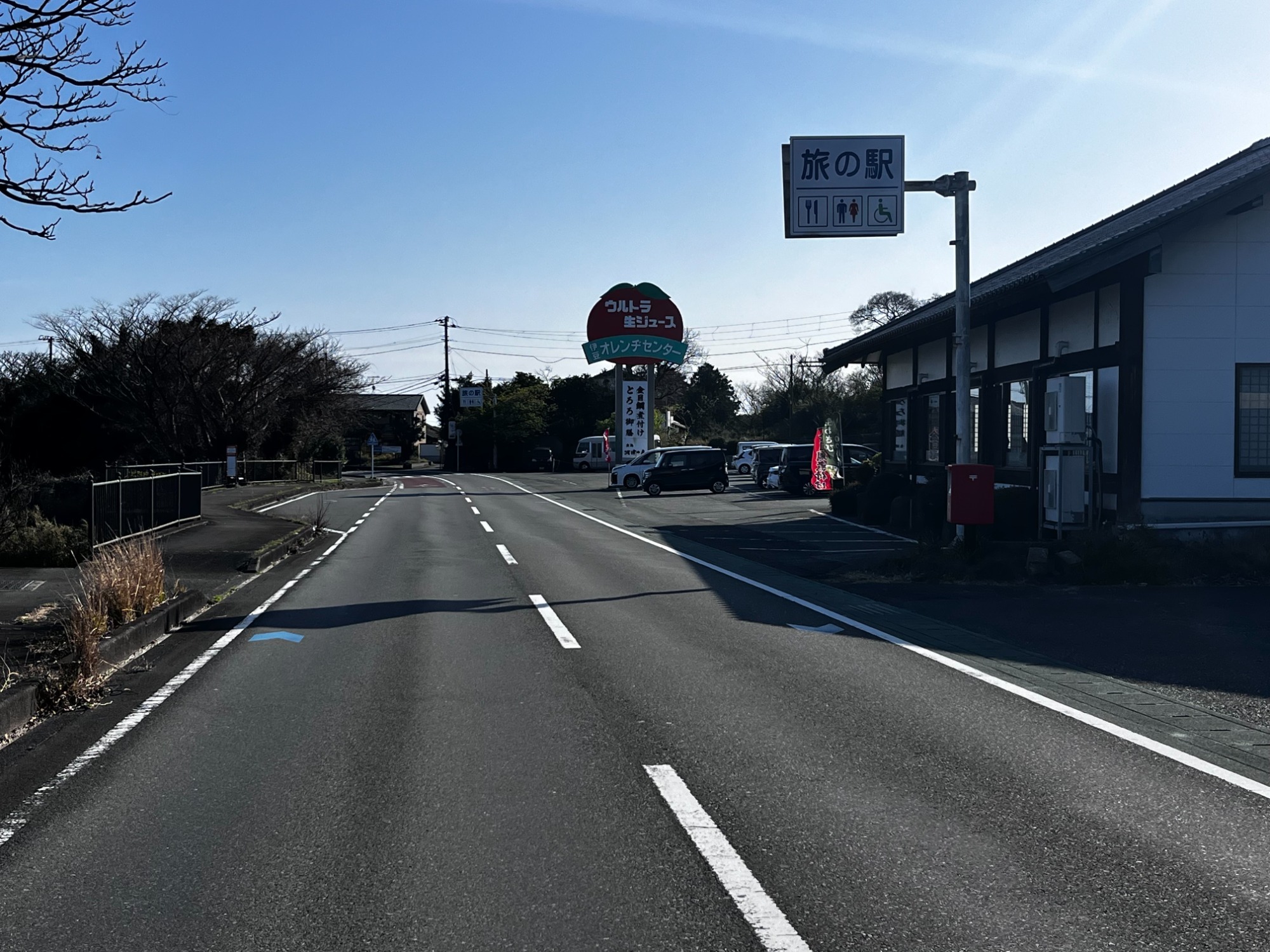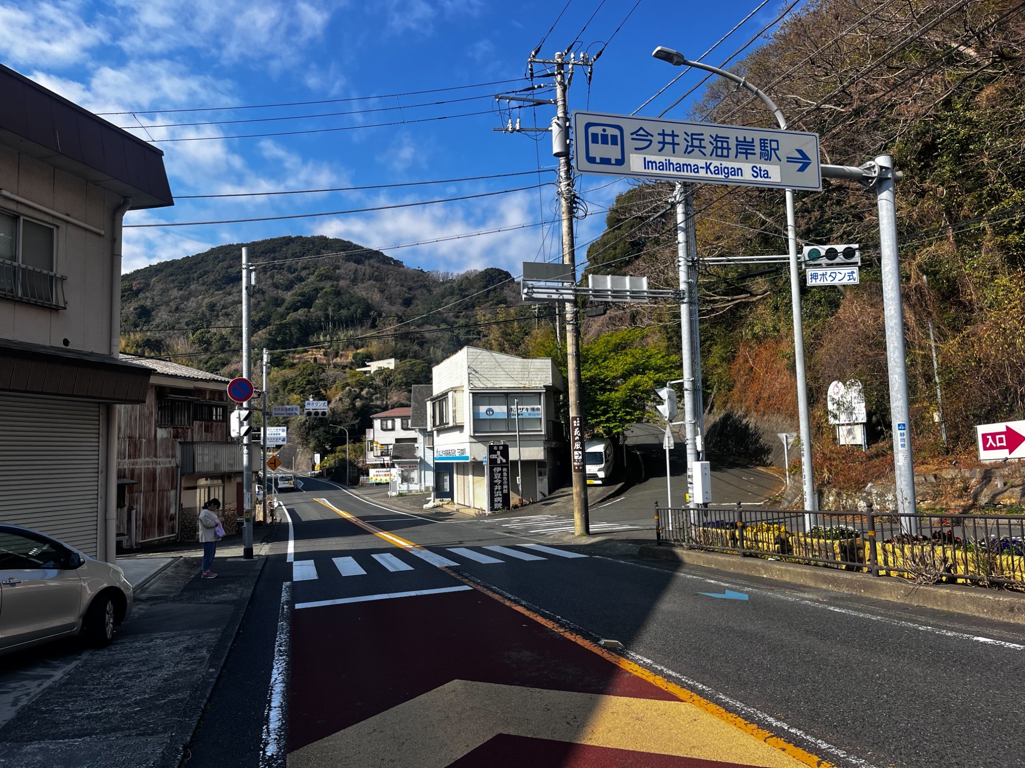 ②旅の駅 伊豆オレンジセンターを通過後、約2kmほど進みますと、「今井浜海岸駅」の案内標識がある信号がございますので、右斜め前方の道へお進みください